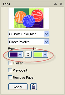 Dengan menggunakan Effects > Lens, sebelumnya buat object kotak dulu diatas object bitmap yang berfungsi sebagai lensa, object kotak dalam keadaan terseleksi kemudian pada menu Docker Lens > Menu drapdown pilih Custom Color Map > From: pilih Warna merah <> To: pilih warna Hijau;