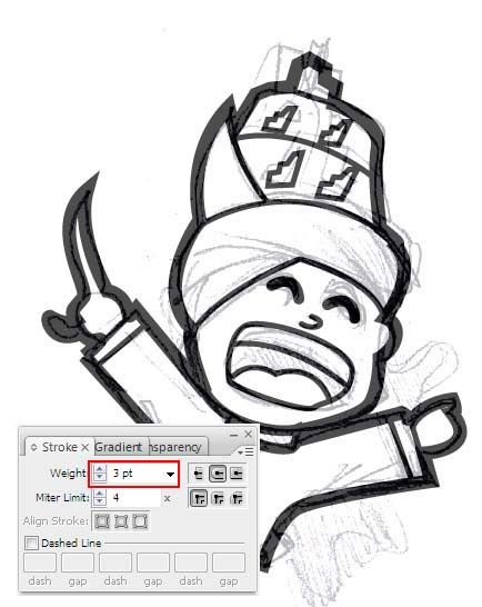 Setelah outline selesai, sekarang gantikan ukuran stroke 3pt (tekan CTRL+F10) untuk menelusuri garis detail seperti tepi topi, mata, mulut, kerah baju, dan garis lainnya.